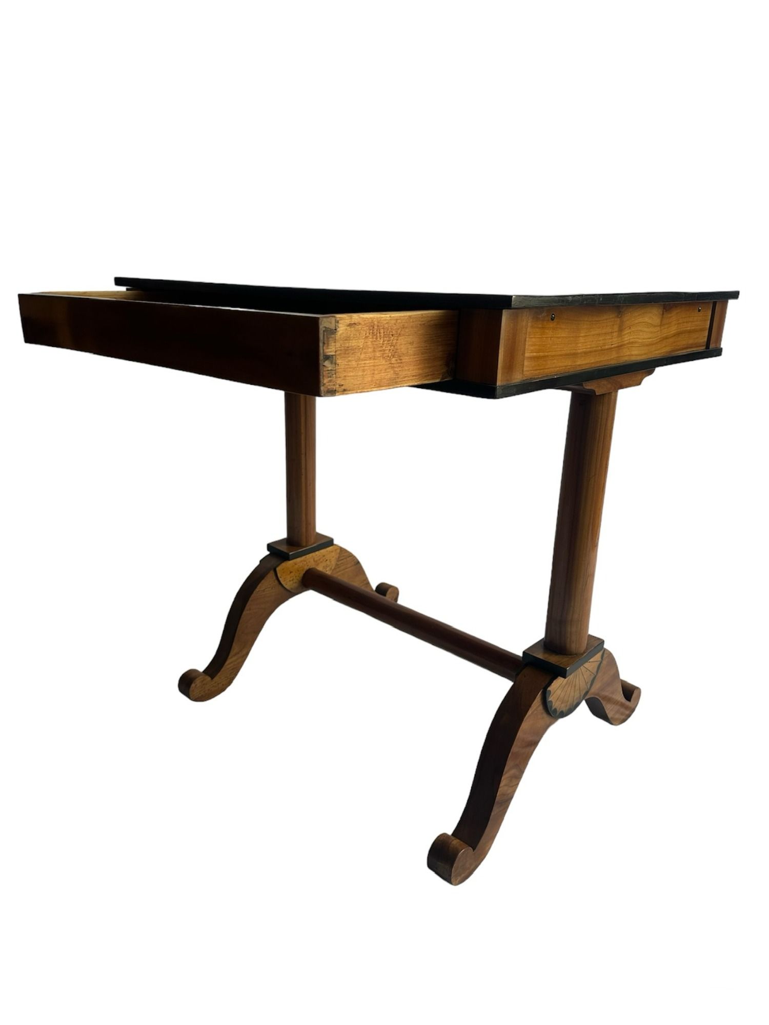 Komplett restauriert mit versteckter Schublade mit Sprungfedern. Tisch Kirschbaum furniert mit zwei massiven Säulen.